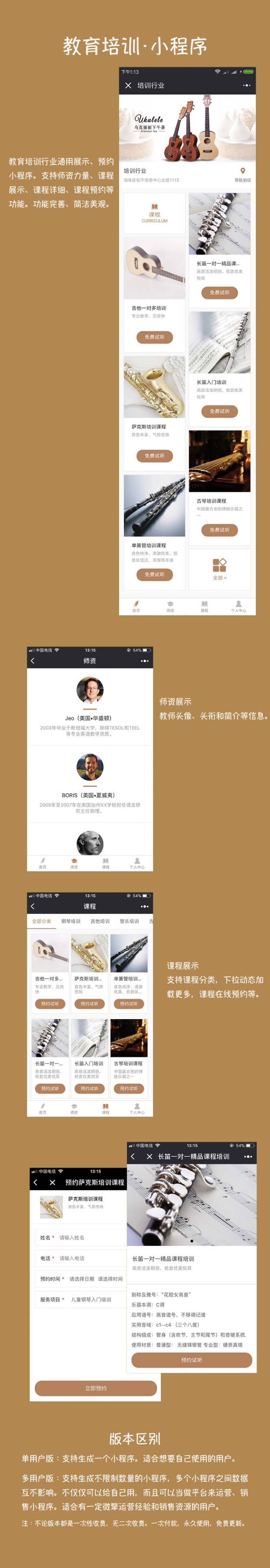 教育培训行业通用展示、预约小程序。实现了师资力量、课程展示、课程预约、新闻文章等功能。