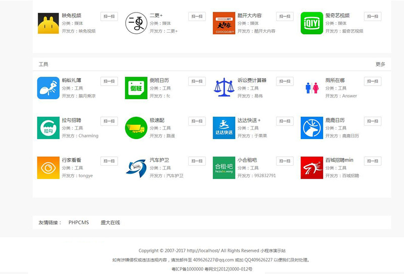 本PHPCMS微信小程序二维码导航网站模板源码带黑色蓝色绿色三个主题样式的CSS,默认是下面截图的颜色,源码亲测无错,不带数据,但是我还是要说一下,本站不保证源码的完整性,远吗仅供学习,如需运营请购买正版或者办理运营资质。 本小程序商店可直接扫码进入。小程序可以通过扫描二维码 二维码或是搜一搜,就能立即使用。 小程序”和公众号 公众号 可以进行关联,并相互跳转。通过公众号查看并进入所绑定的小程序一个公众号可以绑五个小程序。 小程序”可添加到桌面变成APP安卓用户可以将“小程序”可添加到桌面变成APP。也就是说,你完全可以把原生App删掉,用小程序的图标来启动。 小程序”和聊天可以同时进行,并可置顶 在微信里聊天和在微信里看公众号内容,是两件无法同时进行的事。好在,在使用“小程序”的时候,完全不需要担心这一点。 微信好友之间相互推荐、分享“小程序”不仅可以被置顶,还可以在微信群、好友之间被分享。当你发现一个好玩的或者实用的小程序,可以将这个,转发给好友或群聊