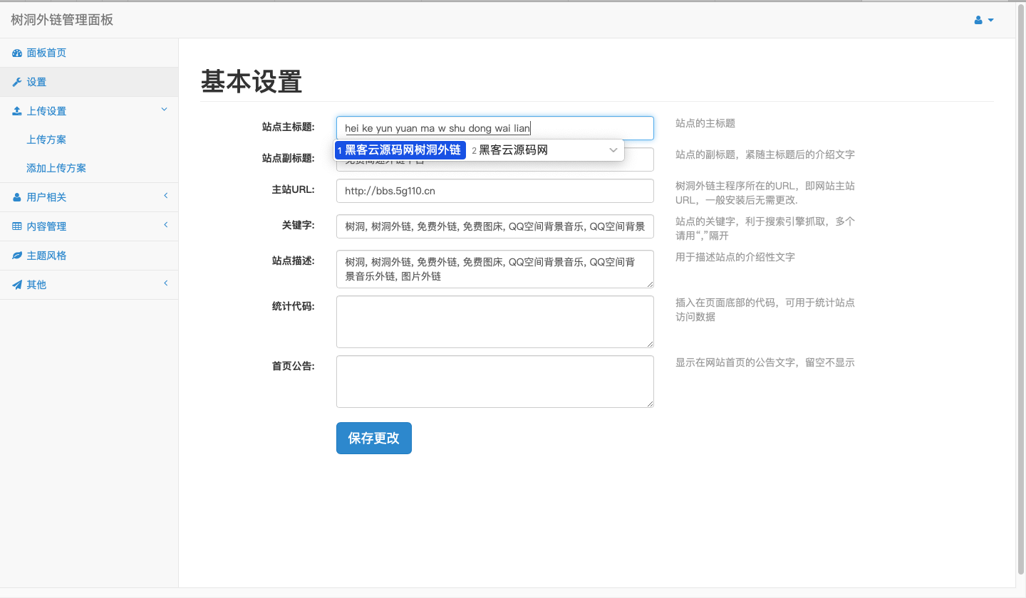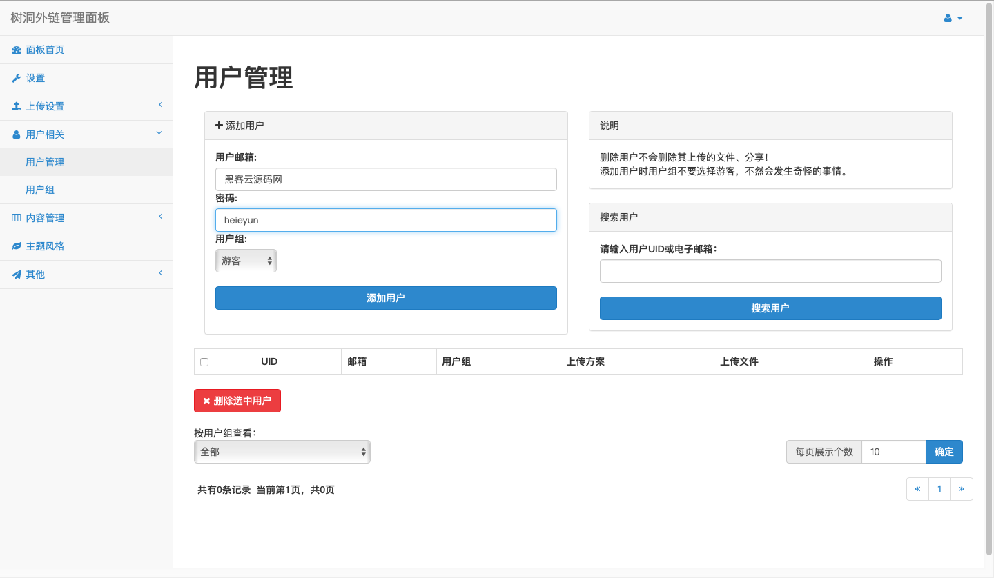 程序特性: 支持多种存储方式 树洞外链允许你将文件存放在不同位置-本地服务器、远程服务器、七牛云存储、阿里云OSS、又拍云存储。你只需进行简单设置就能对接云存储服务。我们后续还将开发支持更多的存储方式。 多用户系统 用户可以注册账号管理查看已上传的文件,你也可以设置不同的用户组并通过出售用户组、邀请码获得额外收入 多上传方案 你可以配置不同的上传方案并绑定至不同的用户组,实现不同用户组的文件以不同方式存储,或者不同用户组对文件有不同的限制。