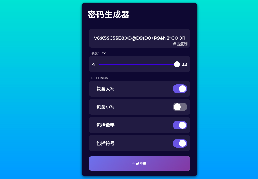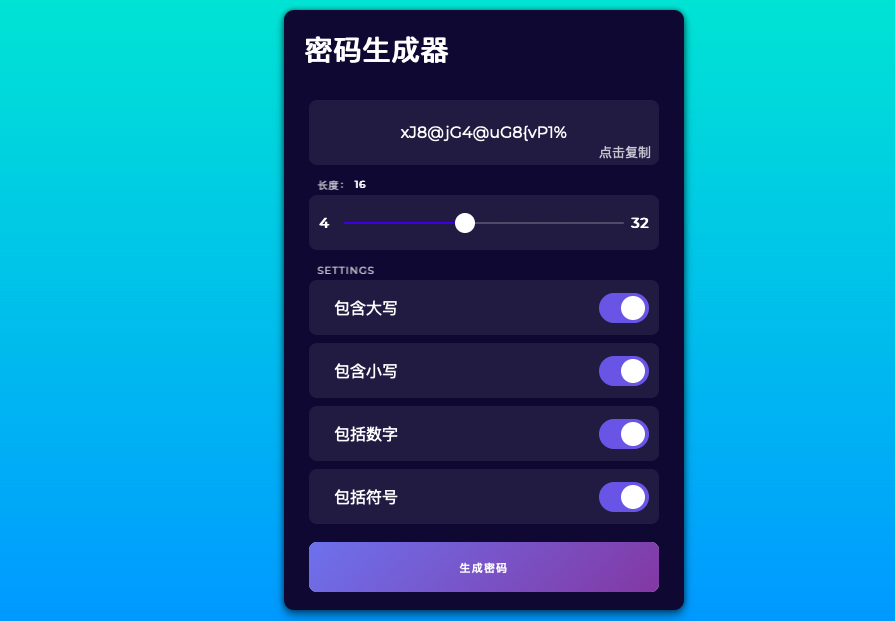 这是一款基于 JavaScript 开发的亲测可用单页随机密码生成工具,核心功能是快速生成符合安全需求的随机密码,无需后端依赖,打开即可使用。