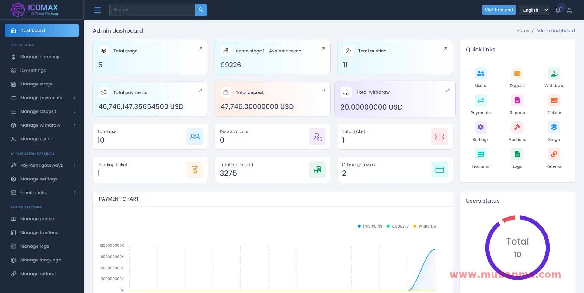 ICOMAX Token Sale & Auction Platform 是一款功能强大的数字资产交易平台,为用户提供了安全、高效的交易环境。该平台基于最新的 Laravel 8.x 框架开发,具有易于安装、多语言支持、在线/离线支付网关、KYC、电子邮件和短信验证等特色功能。此外,ICOMAX 还支持多种支付网关,包括 Razorpay、Coinpayment、Mollie Payment、NowPayments、PayStack、Flutterwave 等。用户可以使用法定货币和多种加密货币进行阶段性销售,并享受拍卖和聊天等功能。无论是个人用户还是企业机构,ICOMAX 都能满足其数字资产交易的需求。