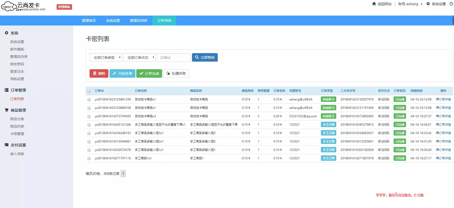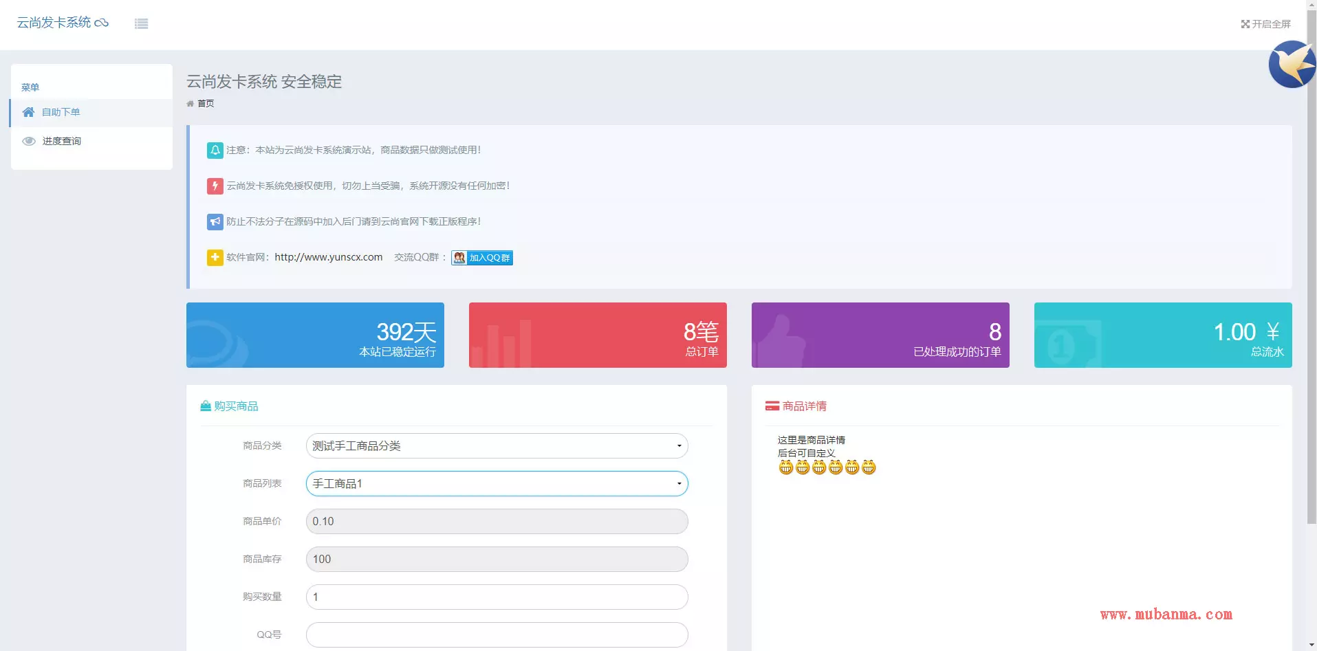 PHP云尚发卡系统V1.4.1源码,专门为个人或小型企业提供在线售卡,订单处理系统。内附安装说明   优点: 1.自动发卡,手工订单双功能 2.新增邮件发送,客户下单后收到卡密邮件,管理员也会收到订单通知 3.新增查询密码,客户数据更安全! 4.使用一键安装,免去安装烦恼 5.新增重复下单限制 6.免授权,免费使用
