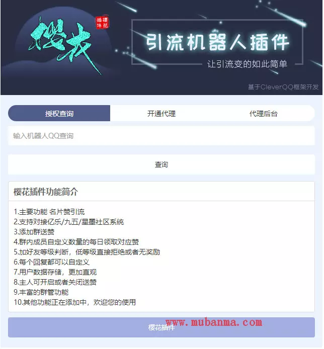 PHP高仿樱花授权程序网站源码,支持对接亿乐,九五,星墨社区系统 安装说明: 1,下载,解压,将程序的全部目录及文件传输至网站根目录。 2,导入“install.sql”数据文件。 3.修改数据库配置文件“config.php”,配置好里面的数据库信息。 4.后台地址:域名/admin 后台账号:admin 后台密码:admin 修改开通代理的 QQ 链接,直接修改“index.php”里的信息即可。