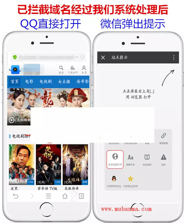 QQ微信域名防封 预防域名封禁 强制跳转至浏览器打开PHP源码,移动运营推广人员必备神器 这个源码是,比如你的域名在QQ 微信里面打不开了!这个源码新建的网站绑定的域名在QQ微信里面就可以打开已经被封掉的域名,运作推广使用!!起到的是这个作用!是防封的作用 而不是把你现在已经封了的域名拦截去掉的意思!!需要1个没有被封的域名,然后1个你推广的域名!!! 做网站的尤其是做一些电影站啥的在微信里面推广的或者一些不太好的比如涉及到钱的什么网站,难免在微信QQ里面经常推广的又难免会被QQ微信拦截。 完美解决了QQ、微信链接报毒的情况,通过技术处理后,用户点击即可打开。省去了复制网址再到浏览器粘贴打开的步骤。增加用户信任度。