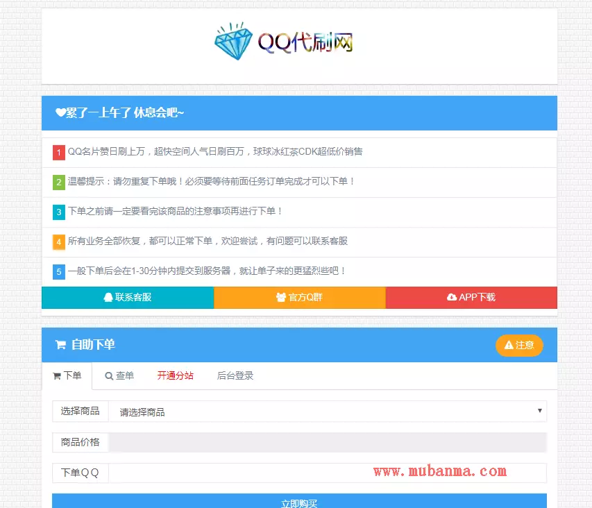 PHP彩虹代刷网V4.7破解版源码,源码已经去授权,修复了后门可以放心使用   V4.7升级说明: 1.新增2套首页模板 2.新增可设置商品与分类图片 3.增加分站自助续期 4.优化数据库索引提升访问速度 5.抽奖页面增加最近中奖记录 6.修复快手ID自动获取 7.修复支付一次出现多个订单的bug 8.首页数据统计缓存功能 9.去除修改支付接口文件锁定 接口申请:www.ylllq.cn