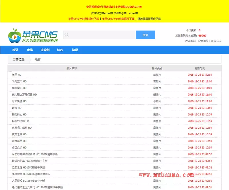 苹果cmsv10蓝色简洁影视电影资源采集网站模板