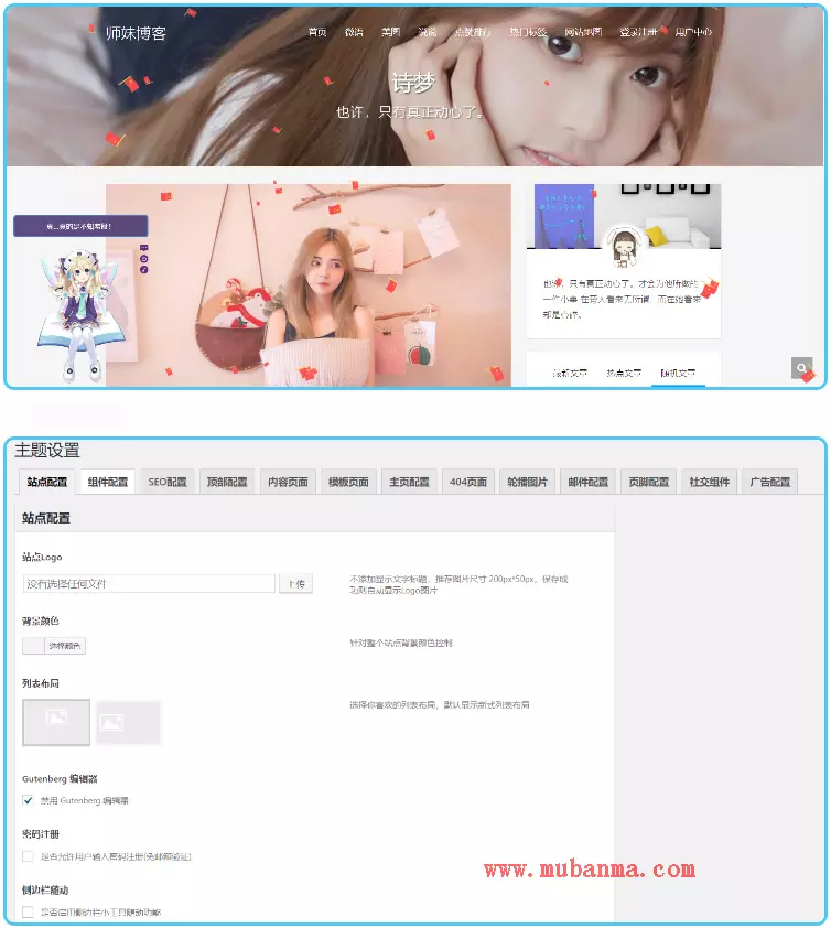 可设置seo关键字及站点描述页面伪静态,自定义的顶部样式(背景图 ),支持图片轮播、侧边栏文章聚合、广告栏、点赞和社交化分享等功能,以及漂亮的博客订阅功能组件,让你的个人博客更加与众不同。