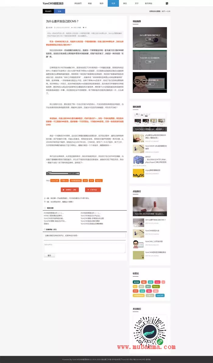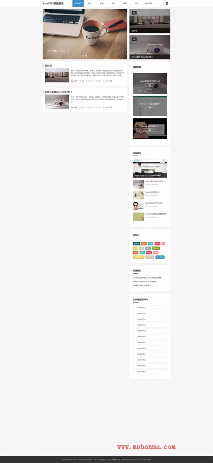 YZMCMS漂亮大气简洁响应式博客模板,内附安装方法和模板说明