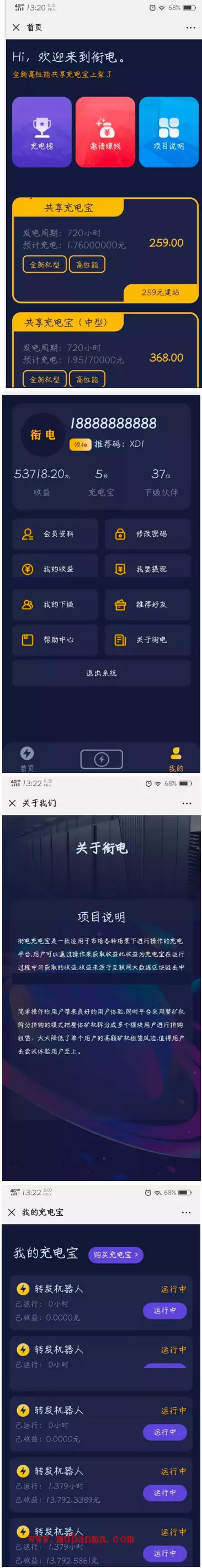 热门街电,共享充电宝,挂机自动赚钱机器人,仿云海广告云点机器人,在云点机器人广告的基础上更新了充电宝UI界面。