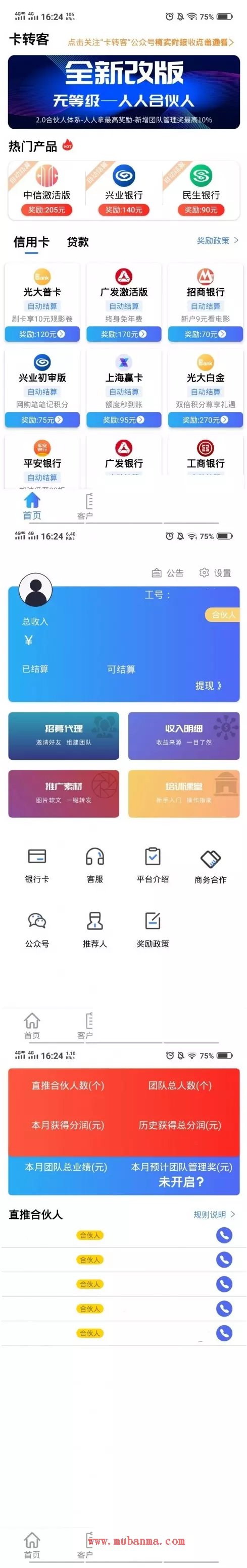 卡转客为国内领先的移动金融推广平台,现已成功和浦发银行、兴业银行、民生银行、光大银行等10余家国有股份制银行,宜人贷、拍拍贷、360借条、玖富等多家知名互联网金融公司达成战略合作。我们将接续秉承开放、共赢理念为卡转客用户提供多角度、全方位服务,助理卡转客用户开启创业之旅。
