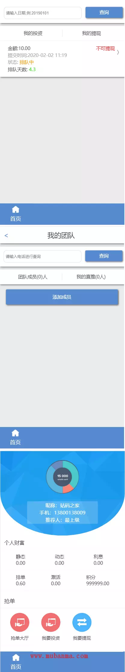 预付款抢单大厅拆分+复利+分红+手机APP抢单+预约排单+诚信+激活+钱包充值。团队激活成员制度,个人中心可实时查看静态和动态收益。