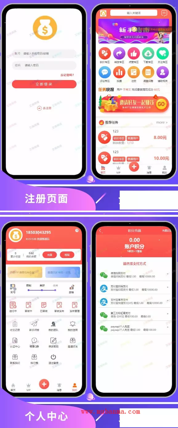 增加头像设置,首页任务接单,主要分为抖音和快手任务关注点赞,用户可以领取符合要求的任务,复制任务打开app关注和点赞,截图提交,后台审核通过后即可领取佣金