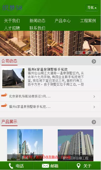 工程类型网站,绿色大气,织梦最新版内核,和手机站无缝对接,同个后台容易管理,DEDE5.5内核以上都可以使用;附带测试数据! 模板特点: 1.模板包括首页(index.htm)、新闻列表页(list_news.htm)、图文列表页(list_product.htm)、单页面(about.htm)、内容详情页(article_article.htm)、留言页(feedback.htm); 2.首页全屏banner展示; 3.拥有案例滚动特效; 4.列表页内容页有最新资讯阅读; 5.支持在线留言; 6.网站色调以绿色为主,整洁、大气; 使用程序: 织梦DEDECMS5.5以上版本都可以使用。 温馨提示: 按照正常的织梦安装步骤来安装还原就可以用了,从后台重新点击保存下系统基本参数。 系统>系统基本参数> 保存(确定)。