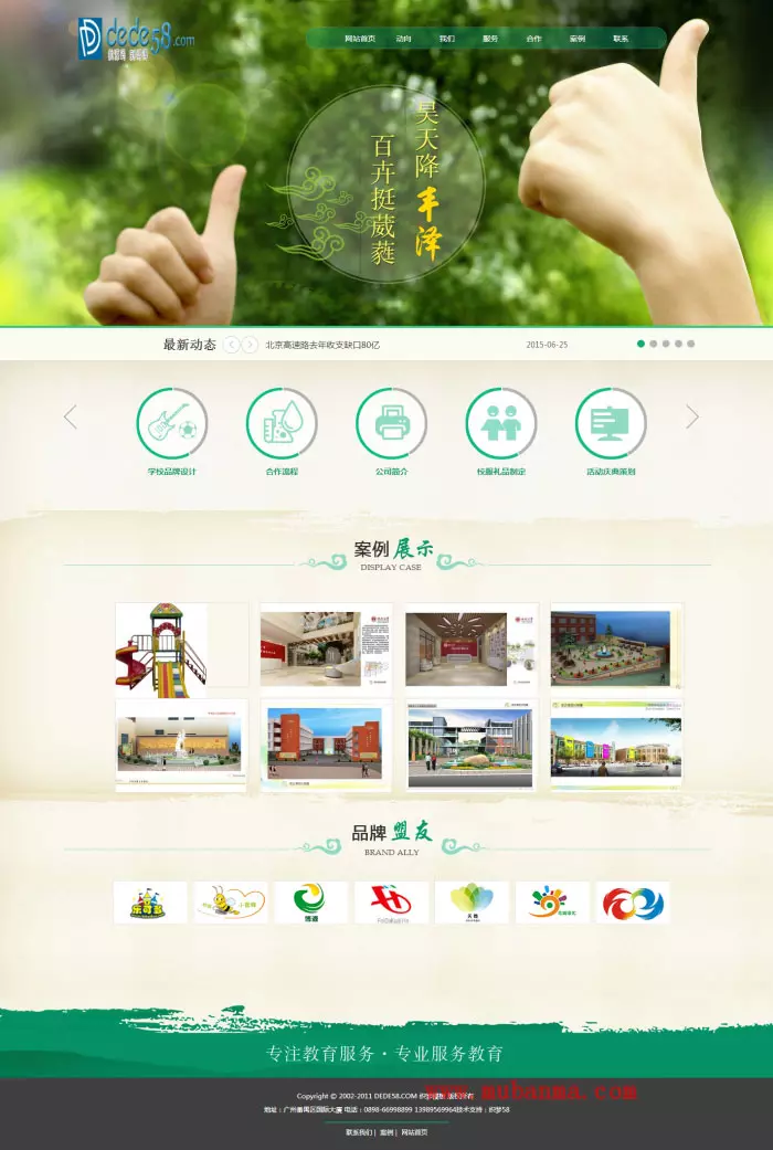 模板介绍: 织梦最新内核开发的模板,该模板属于培训行业,教育企业, 教育培训班饰类,属于企业通用,学校、教育培训等企业均可以使用该模板, 页面简洁简单,容易管理,DEDE5.5内核以上都可以使用;附带测试数据! 模板特点: 整体配色我们采用了非常小清新的绿色和多种颜色融合一起, 给人的感觉非常的美观大气, 首页全版的banner图给人的感觉比较具有视觉冲击力, 总之还是一套非常值得推荐的网站模板, 简洁美观大方绿色的设计风格,图片展示效果绝佳。 页面结构简单,利于SEO的优化,模板后台易于管理。 使用程序: 织梦DEDECMS5.5以上版本都可以使用。 模板页面: index.htm 首页模板 head.htm footer.htm article_article.htm 文章内容 这里不一一列出! 温馨提示: 按照正常的织梦安装步骤来安装还原就可以用了,从后台重新点击保存下系统基本参数。 系统>系统基本参数> 保存(确定)。