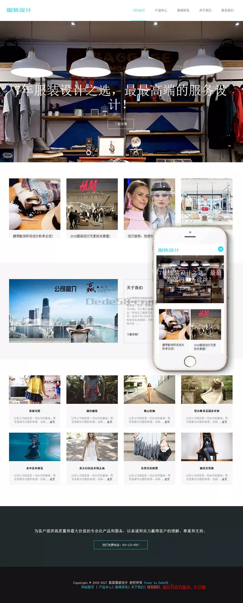 织梦最新内核开发的模板,该模板属于企业通用、HTML5响应式、服装设计展示类企业使用,一款适用性很强的模板,基本可以适合各行业的企业网站! 响应式自适应各种移动设备,同一个后台,数据即时同步,简单适用! 原创设计、手工书写DIV+CSS, 完美兼容IE7+、Firefox、Chrome、360浏览器等;主流浏览器; 页面简洁简单,容易管理,DEDE内核都可以使用;附带测试数据!