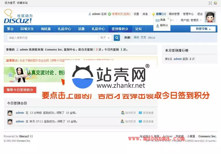 功能主要用于站内推广,签到是聚集人气的地方,签到的广告很快被会员阅读浏览。 1、后台可以配置签到需要点击的广告链接及图片。 2、会员签到需要先点击图片广告后才会显示签到领取积分的按钮。 3、每天只能签到一次,有详细的签到记录,有当月签到排行榜。