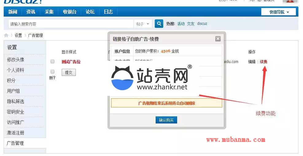 支持按天、按月购买; 支持自定义时长、自定义价格、自定义样式; 可自由选择在哪些页面显示; 会员可以自行管理、编辑已经投放的广告; 同时支持http://链接和https://链接 商业版支持广告文字颜色和字体设置; 商业版支持广告续费功能!