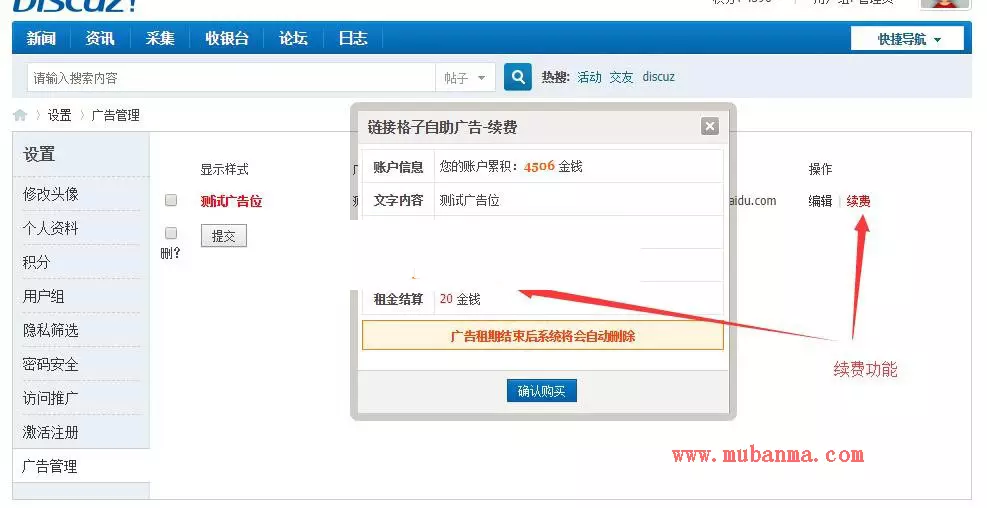 功能介绍: 支持按天、按月购买; 支持自定义时长、自定义价格、自定义样式; 可自由选择在哪些页面显示; 会员可以自行管理、编辑已经投放的广告; 同时支持http://链接和https://链接 商业版支持广告文字颜色和字体设置; 商业版支持广告续费功能!