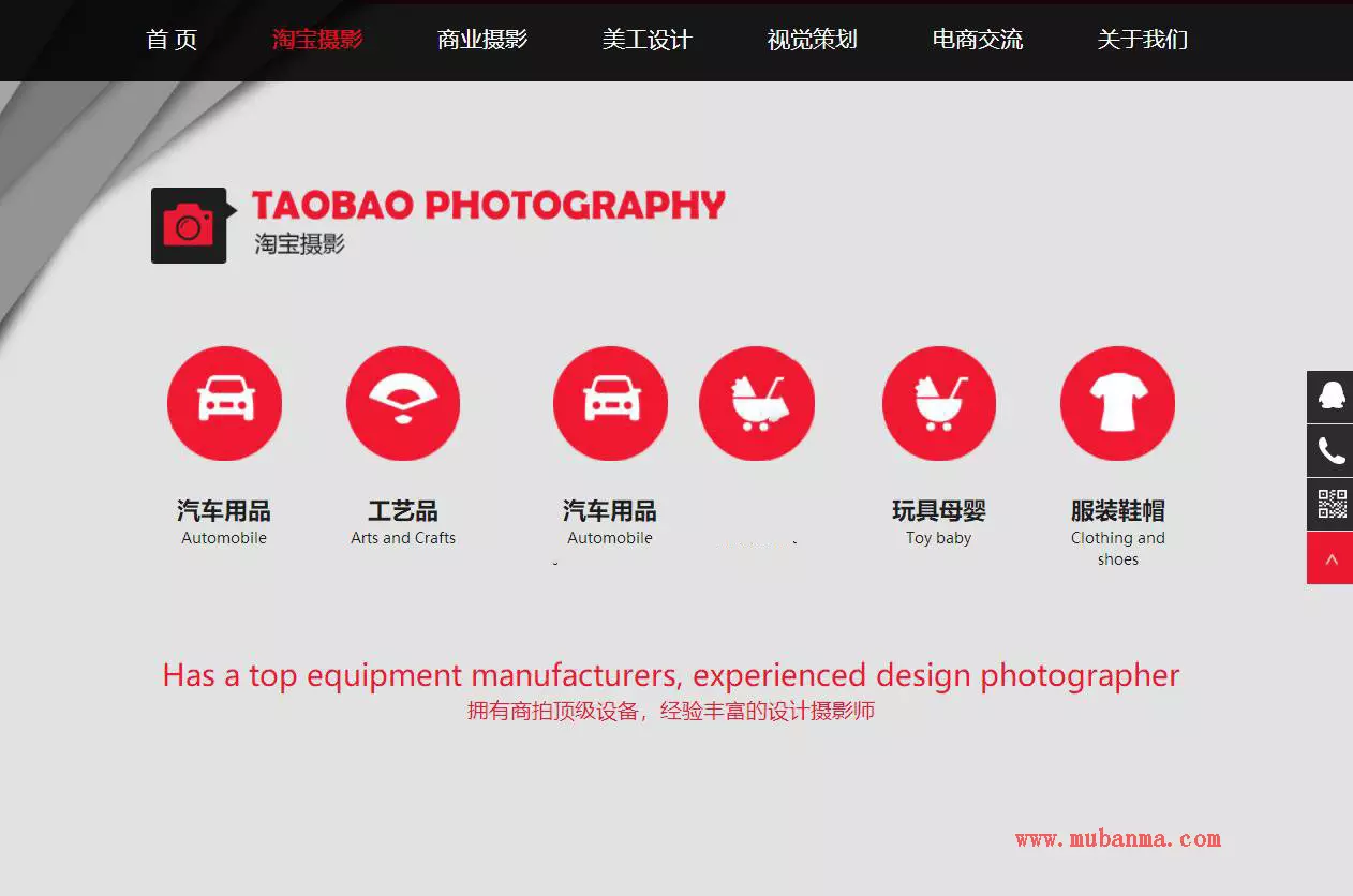 模板介绍: 织梦最新内核开发的模板,该模板属于企业通用类、淘宝美工,淘宝摄影、商业摄影、产品摄影、美工设计、店铺装修类企业都可使用, 这款模板使用范围极广,不仅仅局限于一类型的企业,你只需要把图片和产品内容; 换成你的,颜色都可以修改,改完让你耳目一新的感觉! 自带最新的手机移动端,同一个后台,数据即时同步,简单适用! 原创设计、手工书写DIV+CSS, 完美兼容IE7+、Firefox、Chrome、360浏览器等;主流浏览器; 页面简洁简单,容易管理,DEDE内核都可以使用;附带测试数据!
