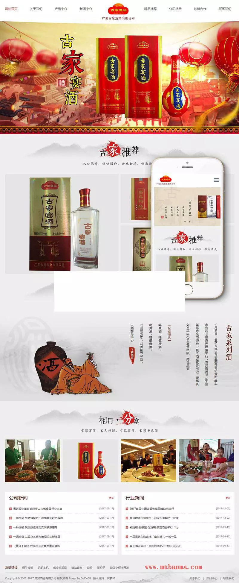 织梦最新内核开发的模板,该模板属于响应式自适应、古家窖酒、古家苦荞酒、古家宴酒、古氏特酿类企业使用,一款适用性很强的模板,基本可以适合各行业的企业网站! 响应式自适应各种移动设备,同一个后台,数据即时同步,简单适用! 原创设计、手工书写DIV+CSS, 完美兼容IE7+、Firefox、Chrome、360浏览器等;主流浏览器; 页面简洁简单,容易管理,DEDE内核都可以使用;附带测试数据!