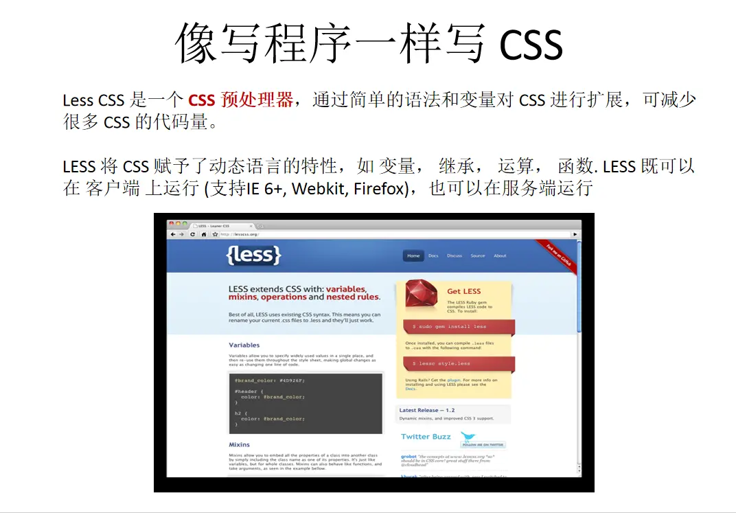 LESS 将 CSS 赋予了动态语言的特性,如 变量, 继承, 运算, 函数. LESS 既可以在 客户端 上运行 (支持IE 6+, Webkit, Firefox),也可以在服务端运行